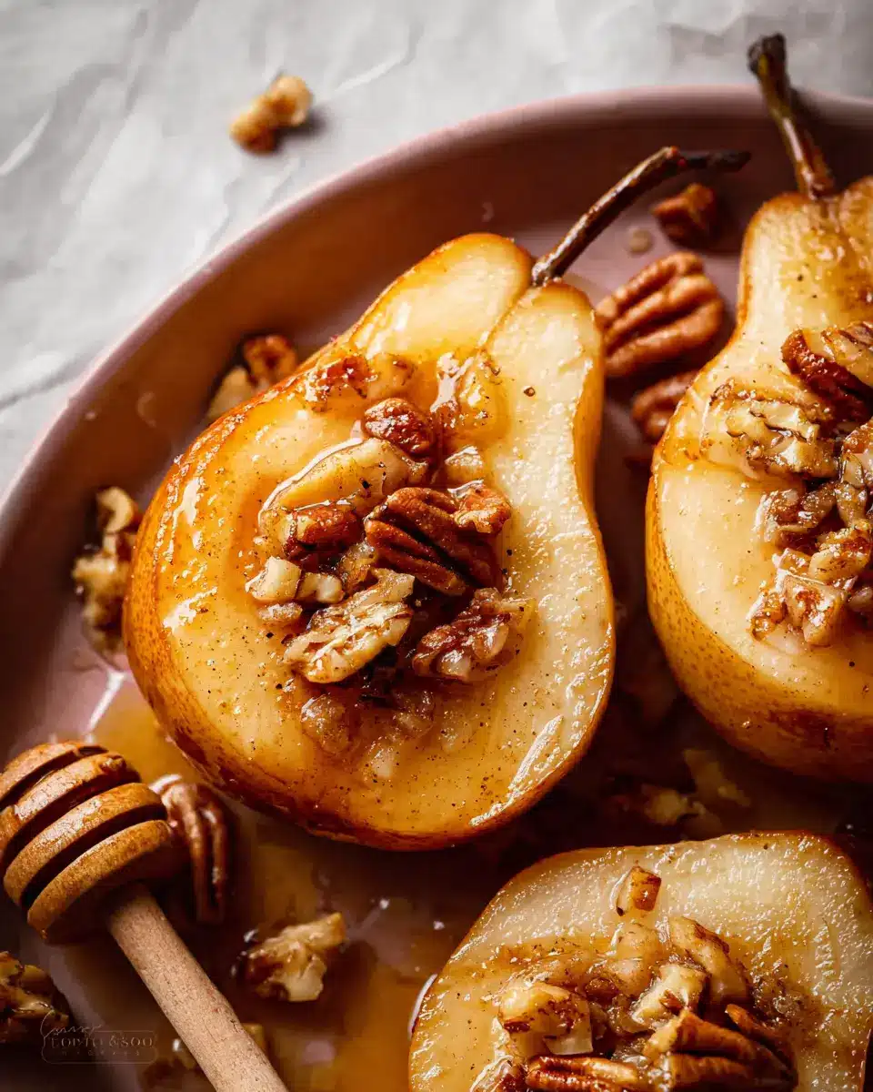 - While the pears are baking, combine the remaining honey, cinnamon, and vanilla with pecans. Pour over the pears and bake for 10 more minutes or until soft and slightly golden.