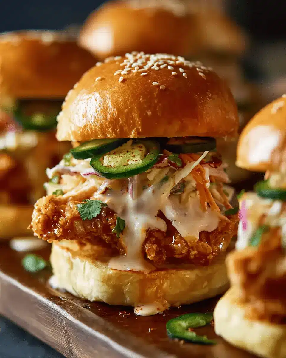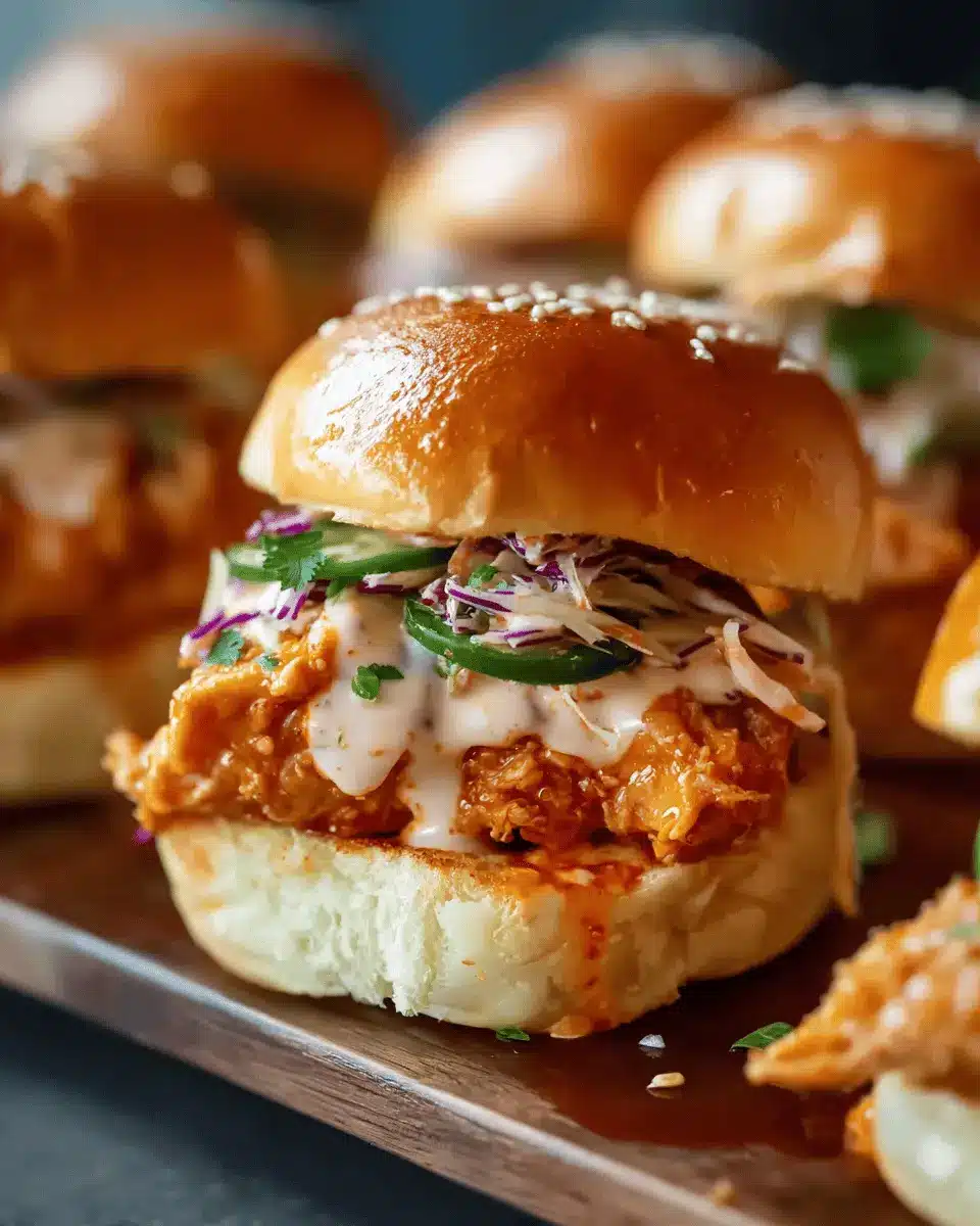 For a delicious vegetarian twist, try swapping out the chicken for crispy cauliflower bites. Simply coat the cauliflower florets in your buttermilk mixture and Panko breadcrumbs, then bake or fry until golden. Toss these bites in the same spicy Bang Bang sauce to capture that irresistible flavor. Not only are these sliders great for plant-based eaters, but they also satisfy everyone at the party!