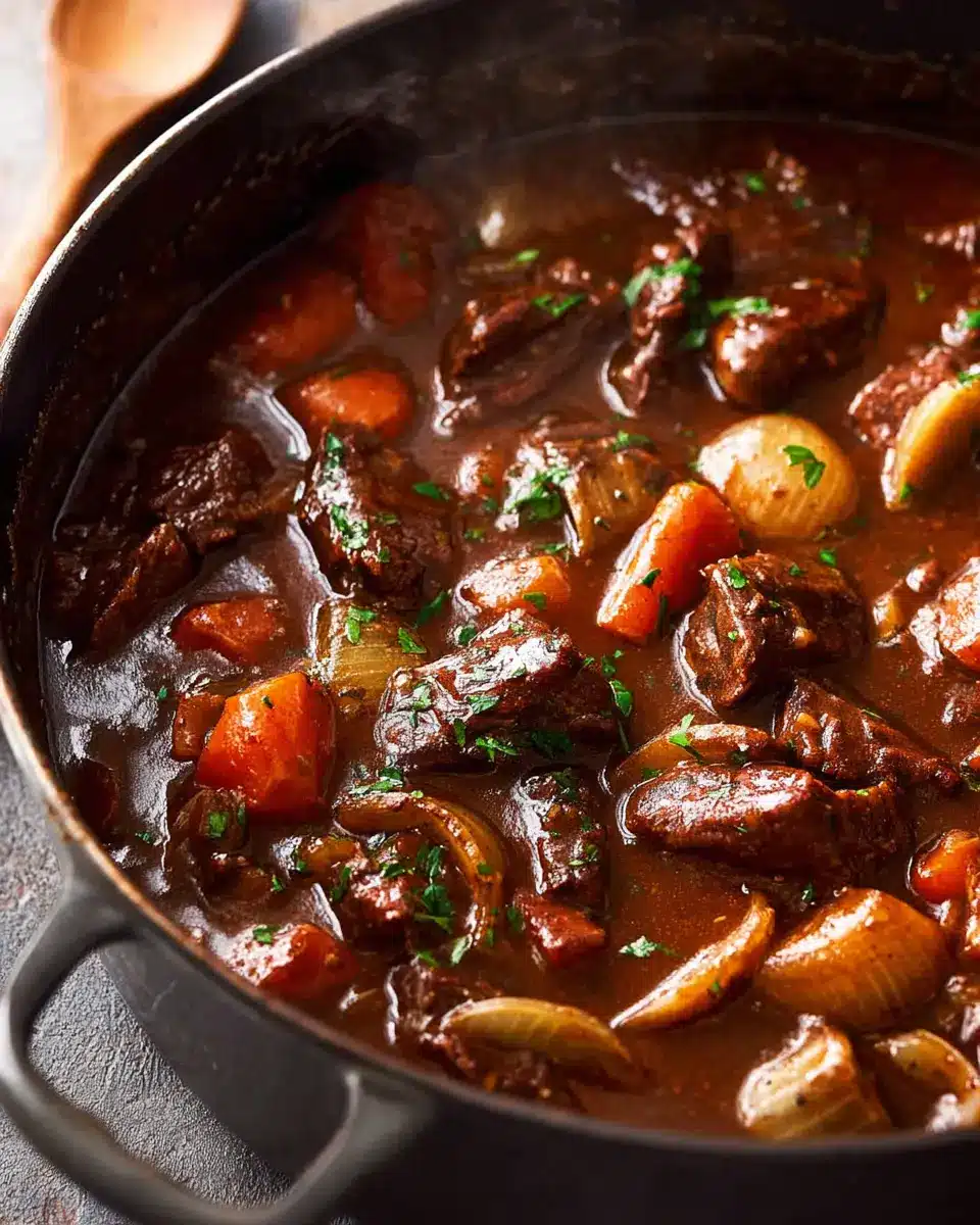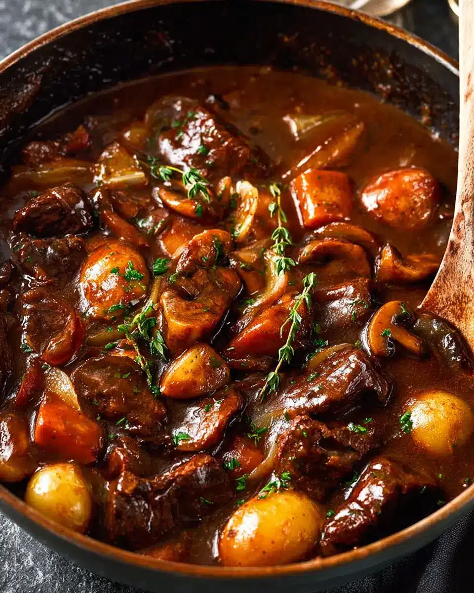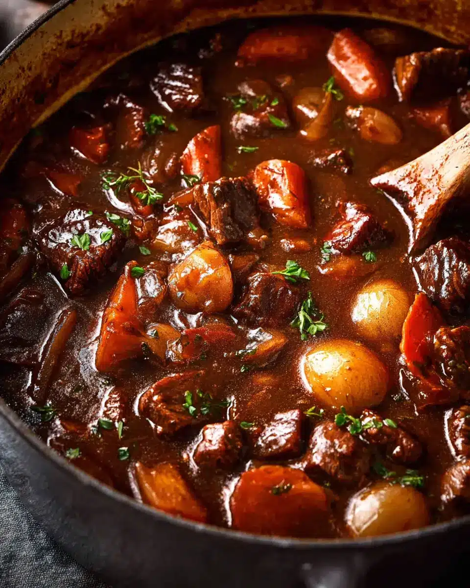 Presentation matters! A sprinkle of fresh chopped parsley not only adds a vibrant splash of color but also elevates the dish visually and flavor-wise. For that gourmet touch, serve with a few whole thyme sprigs or a twist of citrus zest to brighten up the robust flavors. Adding these simple yet effective garnishes enhances the overall experience, making your beef bourguignon feel like fine dining at home.