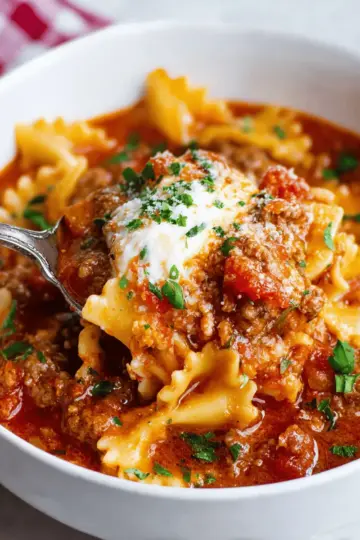 Lasagna Soup with Creamy Basil Ricotta Topping