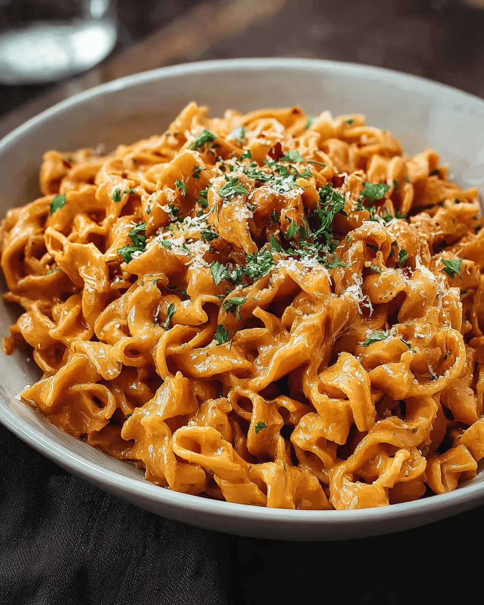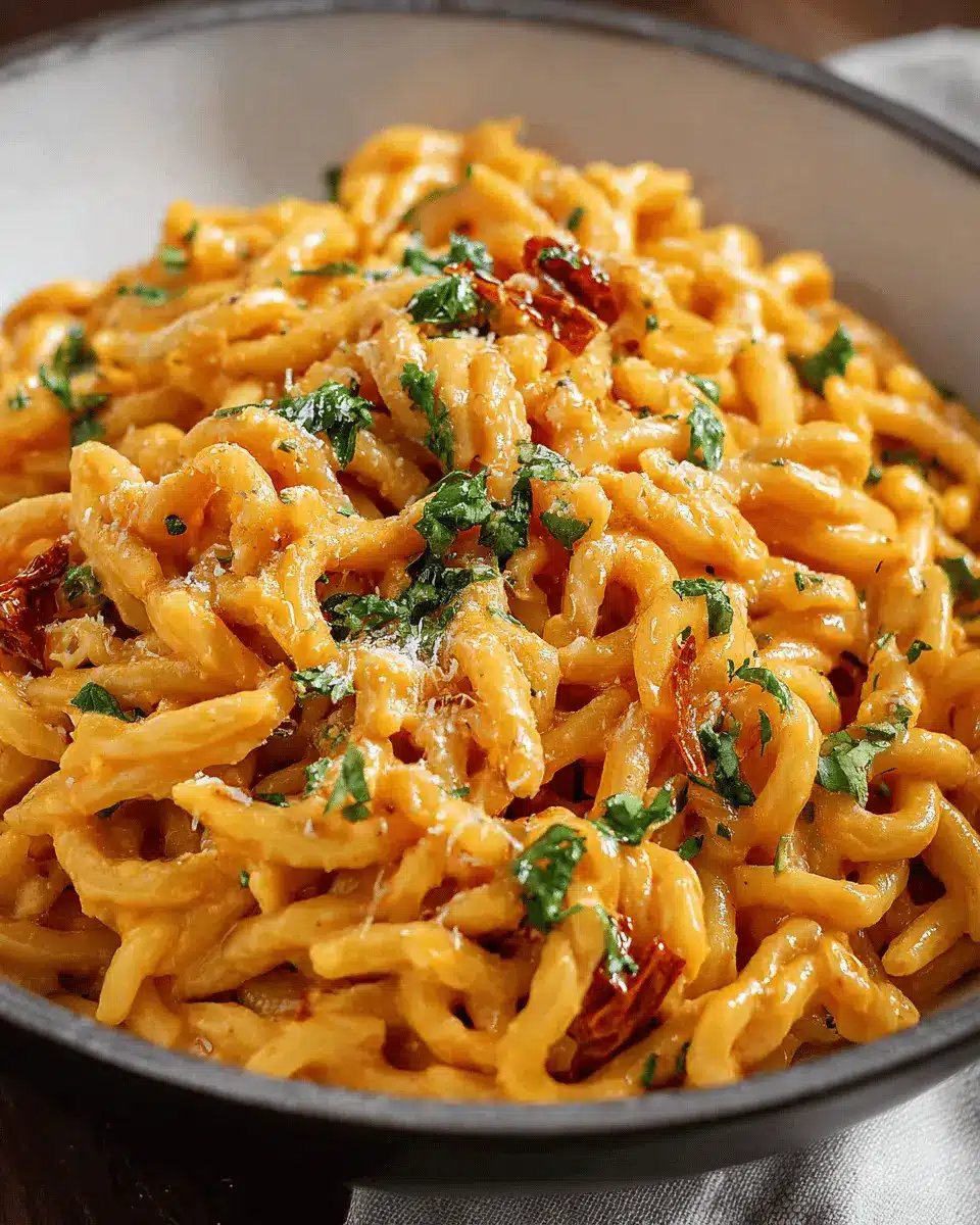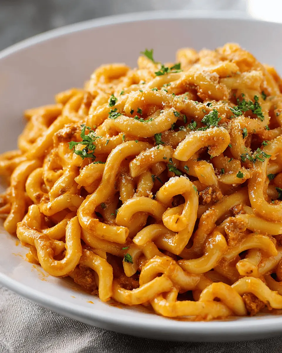 Once your sauce is creamy and spicy, it’s time to bring the pasta back into the fold. Pour the drained cavatappi into the skillet, ensuring every piece is lovingly coated in that gorgeous red sauce. Toss everything together gently but thoroughly—this is where the flavors meld together beautifully.