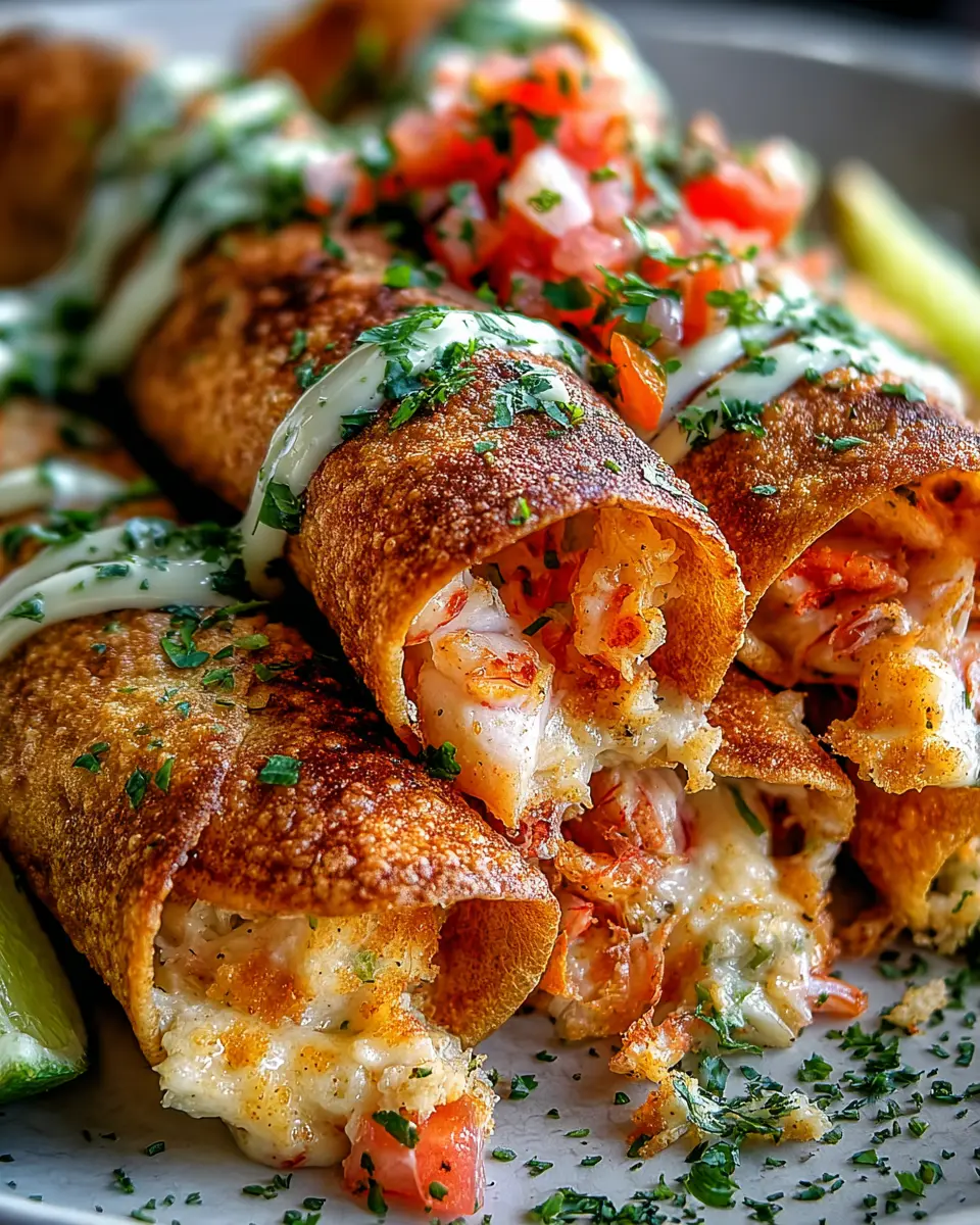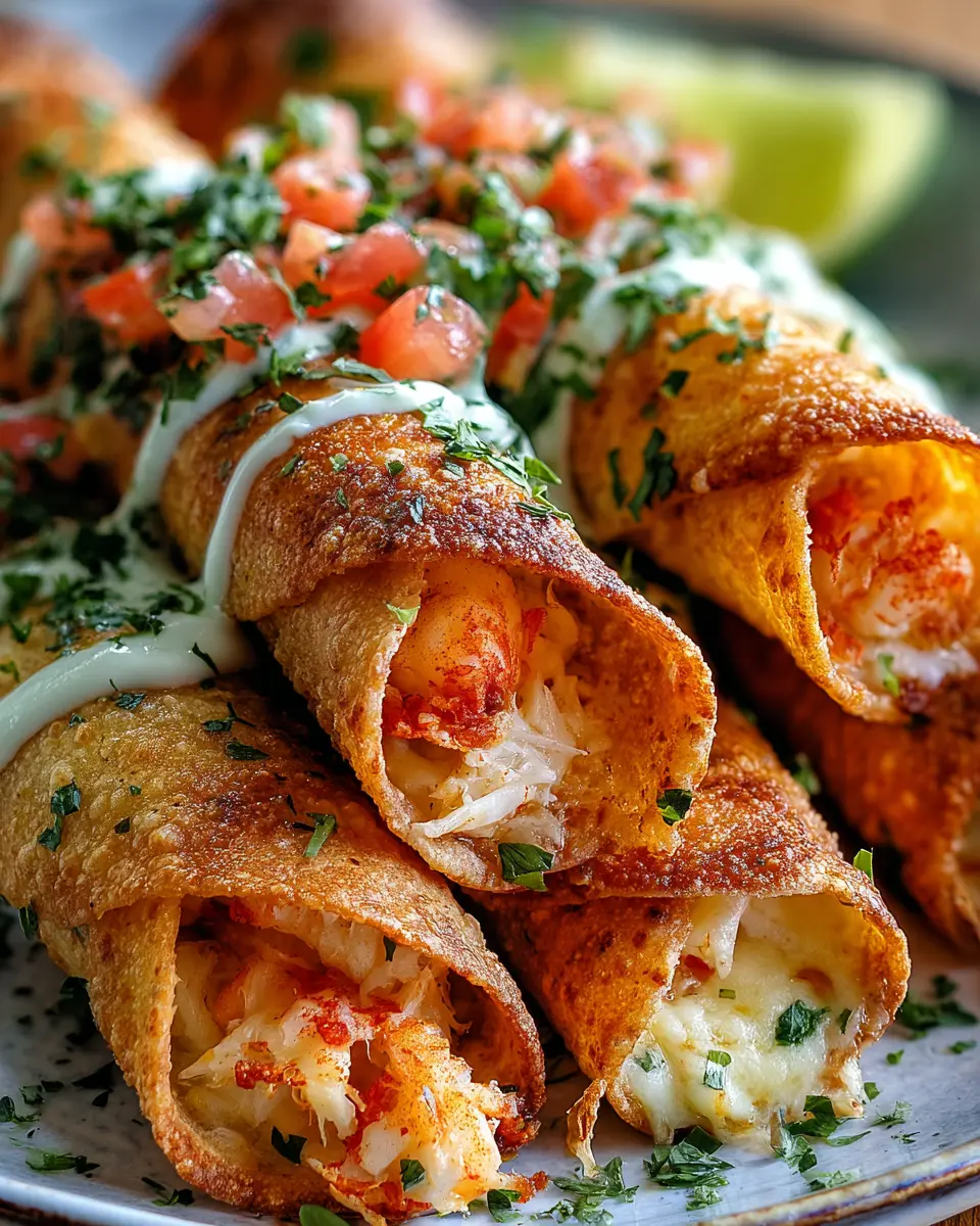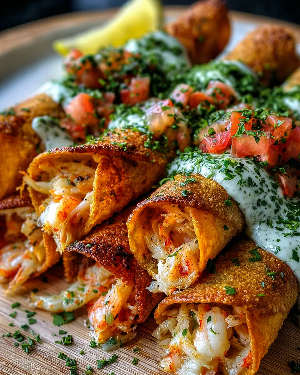 The final step is the best one—serving your Crispy Crab And Shrimp Queso Taquitos! Serve them hot, straight from the pan for that perfect combination of crunch and melty goodness. Consider garnishing them with fresh cilantro, sliced green onions, and a squeeze of lime juice for that extra zesty touch. Pair them with your favorite dipping sauce, like salsa or a creamy avocado dip, and watch your friends and family devour them!