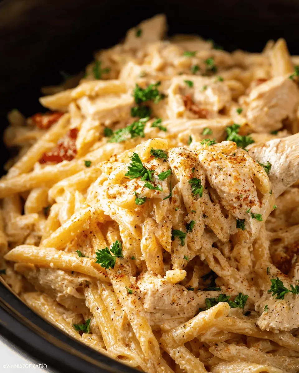 - Whisk the sauce in the crock pot. Return the chicken back to the crock pot and stir in the uncooked pasta.
