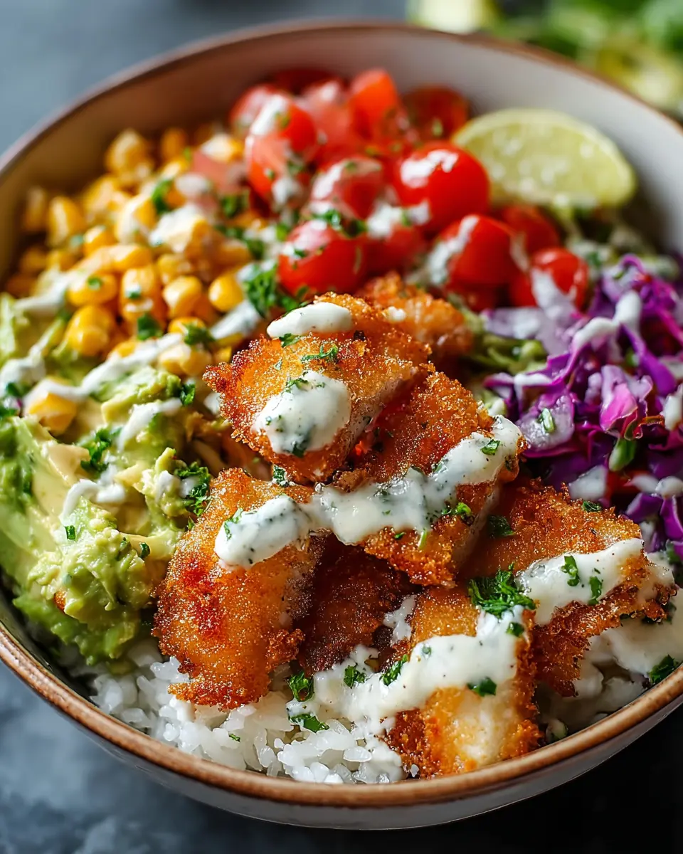 Now for the fun part—assembling your Delicious Crispy Fish Taco Bowls! Start with a base of cooked rice, then layer on black beans, corn, halved cherry tomatoes, sliced avocado, and shredded lettuce. Top it all off with your perfectly fried fish fillets before drizzling that creamy sauce over everything. Finish with a sprinkle of fresh cilantro and a squeeze of lime, and your colorful bowls are ready to serve!