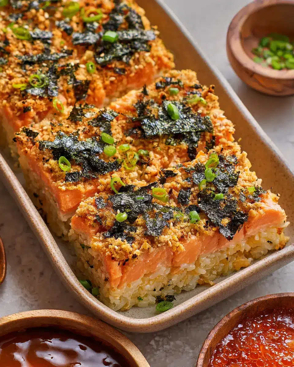 Your easy salmon sushi bake is not just delicious; it’s also a feast for the eyes! Serve it in colorful bowls with a sprinkle of furikake on top to bring a pop of color. Consider using individual ramekins for a fun, personalized portion. You could also create a sushi bar setup, where guests can scoop some bake on nori squares or use tortilla chips for dipping.