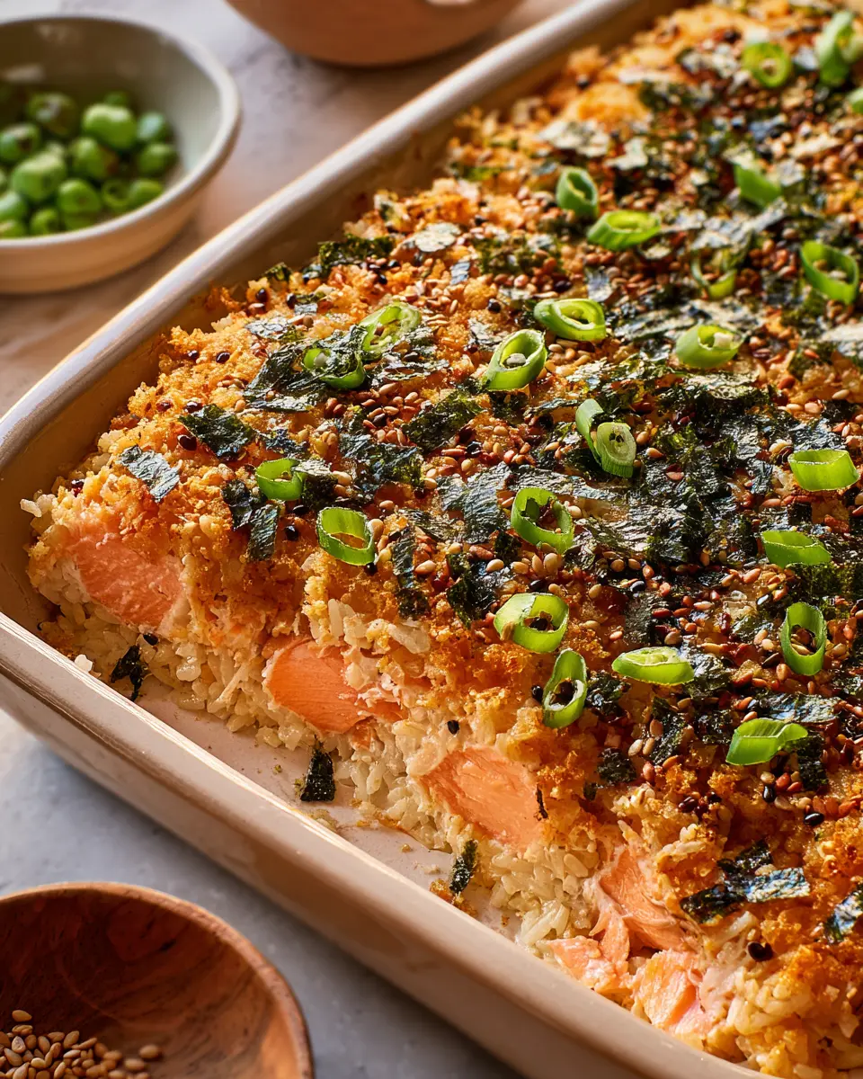 To round out your meal, pair your sushi bake with a light salad dressed in sesame vinaigrette or a side of edamame sprinkled with sea salt. A refreshing miso soup would complement the flavors beautifully. For drinks, try green tea or sparkling water with a splash of citrus—perfect for cleansing the palate! Enjoy the comfort and creativity that comes with your easy salmon sushi bake!