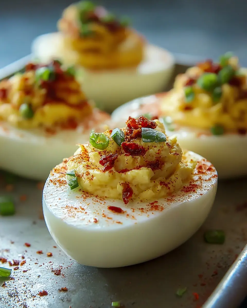 - Assemble the Eggs: Use a spoon or piping bag to fill each egg white half with your creamy yolk mixture. For extra flair, top each filled egg with reserved bacon, a sprinkle of smoked paprika, and a touch of chives if desired.