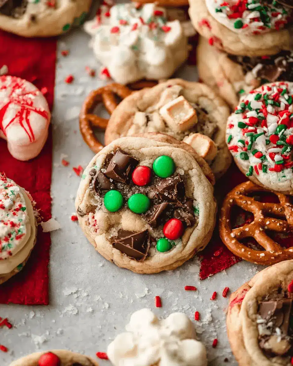 Once baked, let them cool on the baking sheet for a few minutes before transferring them to a wire rack. Enjoy these Kitchen Sink Christmas Cookies warm for that gooey, melty texture—an absolutely divine treat!