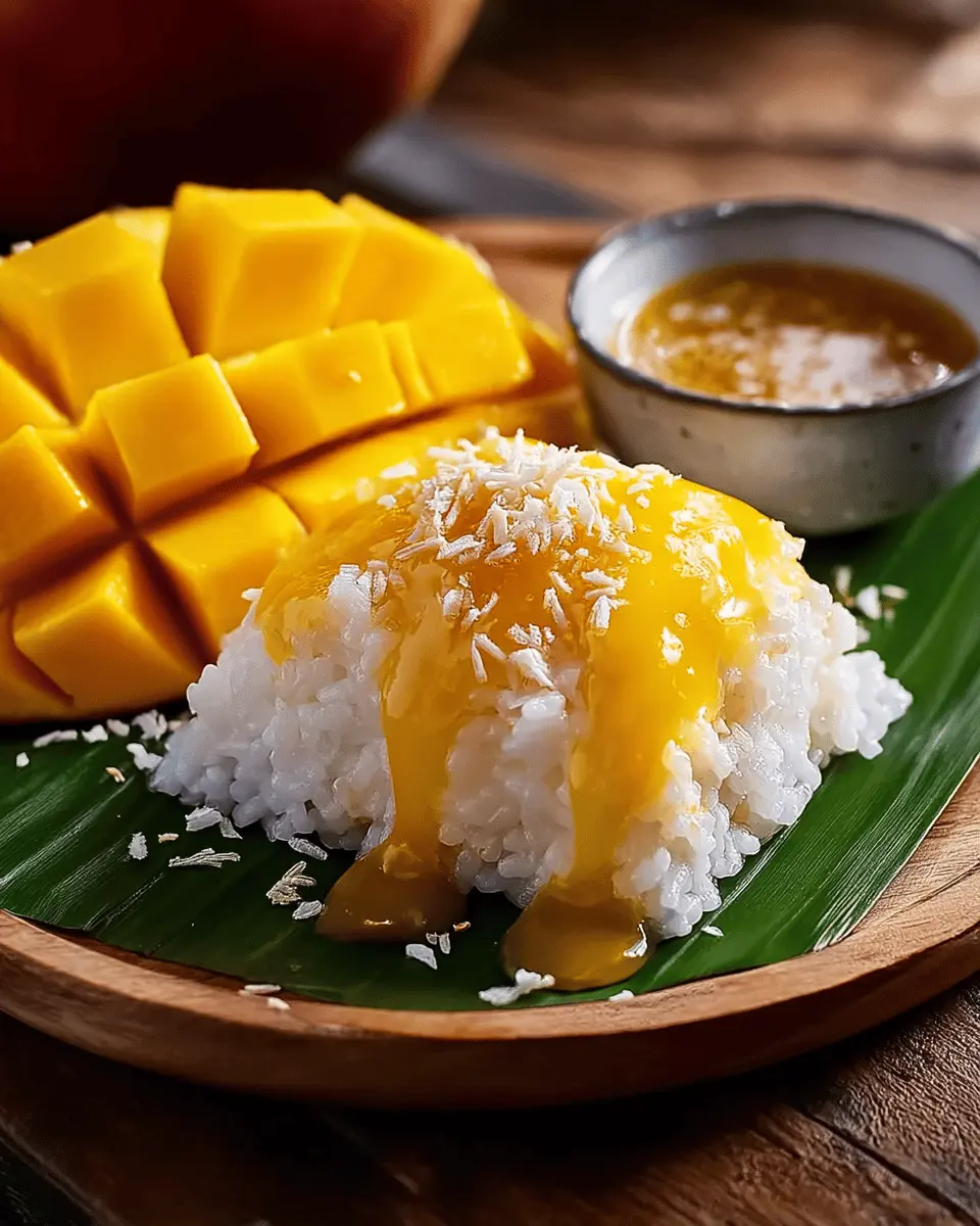 - Serve the rice in bowls, add the mango cubes, and drizzle with the remaining coconut milk.
