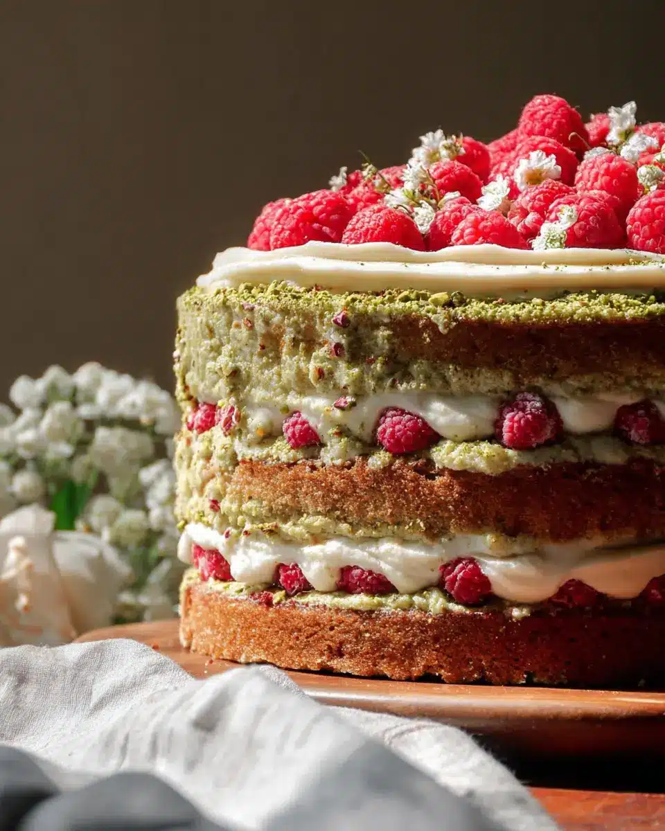 Top your layered masterpiece with remaining mascarpone cream and fresh raspberries. Slice, serve, and enjoy the delightful combination of flavors in this Pistachio Raspberry Cake!