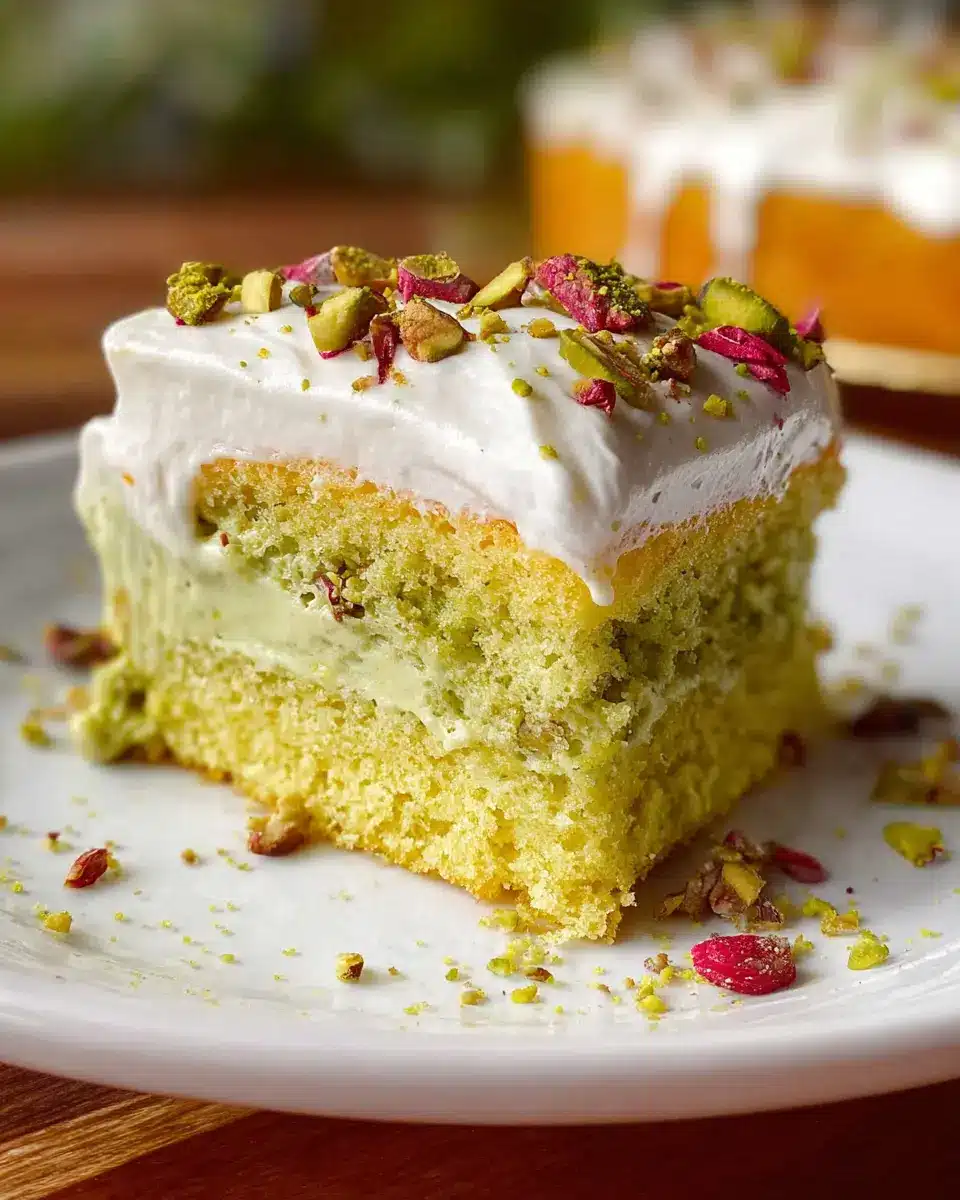 Presentation is key when showcasing your Pistachio Tres Leches Cake. Serve it on a vibrant plate or a rustic wooden board for a stunning contrast. Garnish with crushed pistachios and edible flowers for a pop of color. For a touch of elegance, drizzle a little pistachio cream around the edges and add a dollop of whipped cream on the side. Don’t forget to slice it into neat squares for that Instagram-ready look!