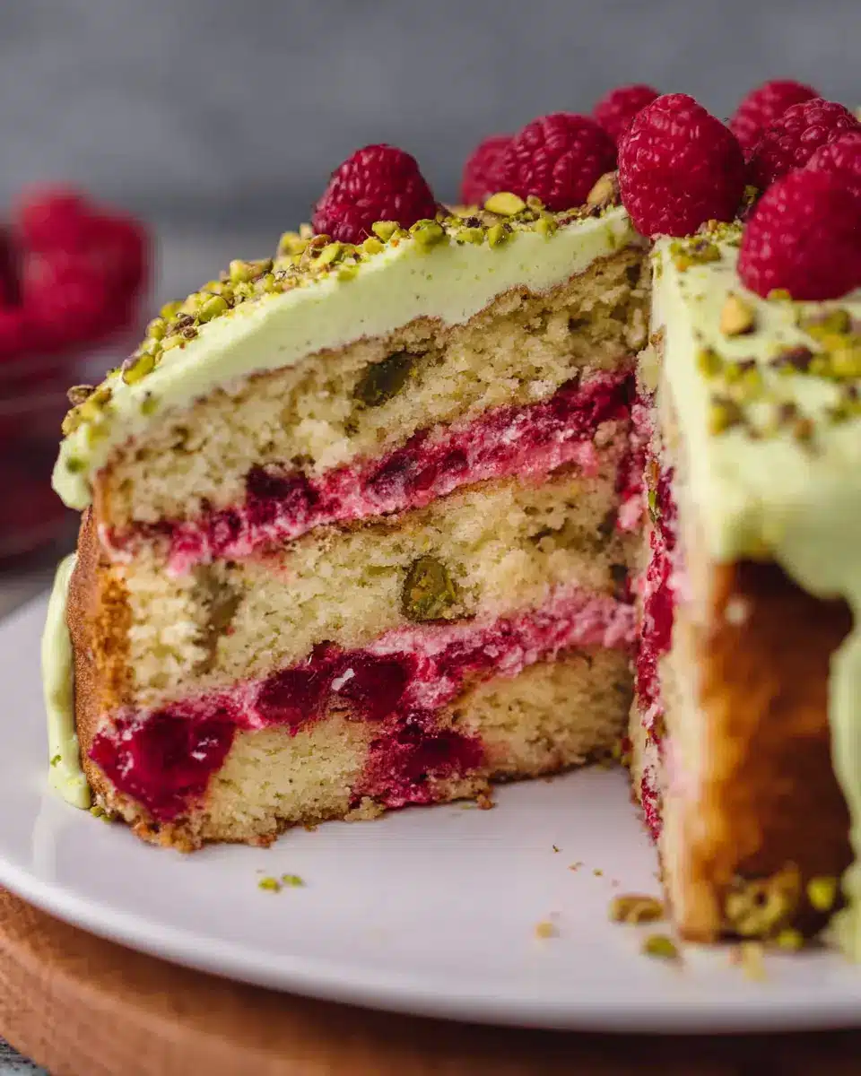 - Add a semicircle of fresh raspberries and chopped pistachios around the top of the cake.