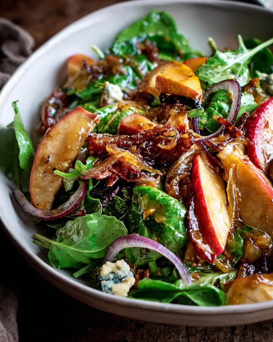 Finally, it’s time to bring everything together! In a large mixing bowl, toss in your mixed greens and arugula. Add the roasted apples, toasted pecans, chopped turkey bacon, crumbled blue cheese, and raisins. Drizzle the caramelized shallot vinaigrette over the top and gently mix until everything is well-coated.