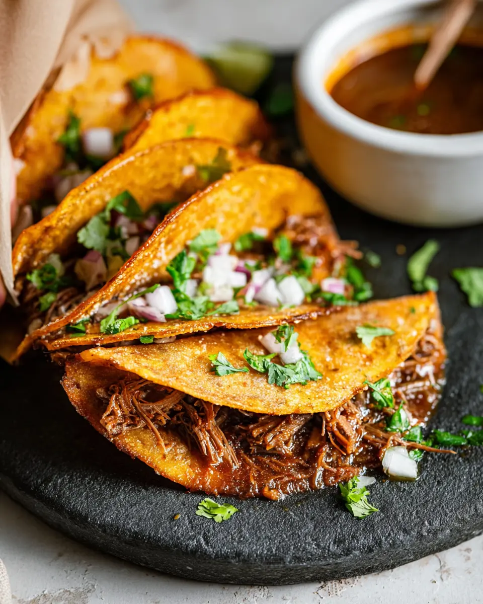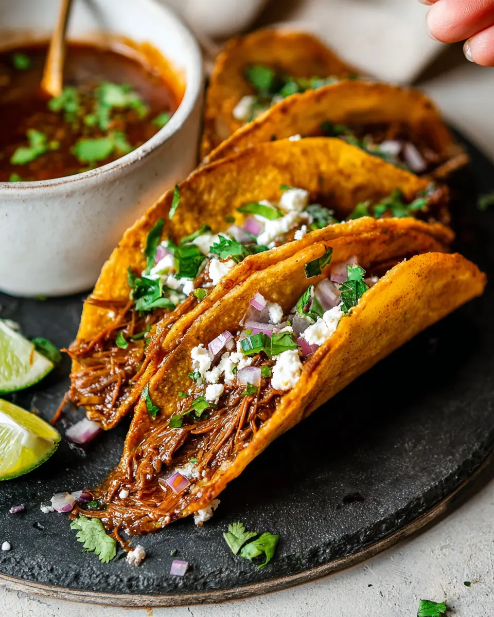 Slow cooker birria tacos are a delicious, hearty dish originating from Mexico, known for their flavorful, juicy beef and crispy tortillas. The birria is made by slow-cooking beef, which absorbs a rich blend of spices and flavors until it's tender enough to shred. When paired with warm tortillas, melted cheese, and savory consommé, each taco is a celebration of taste and texture. This dish is not just a meal; it's an experience that brings friends and family together around the table.
