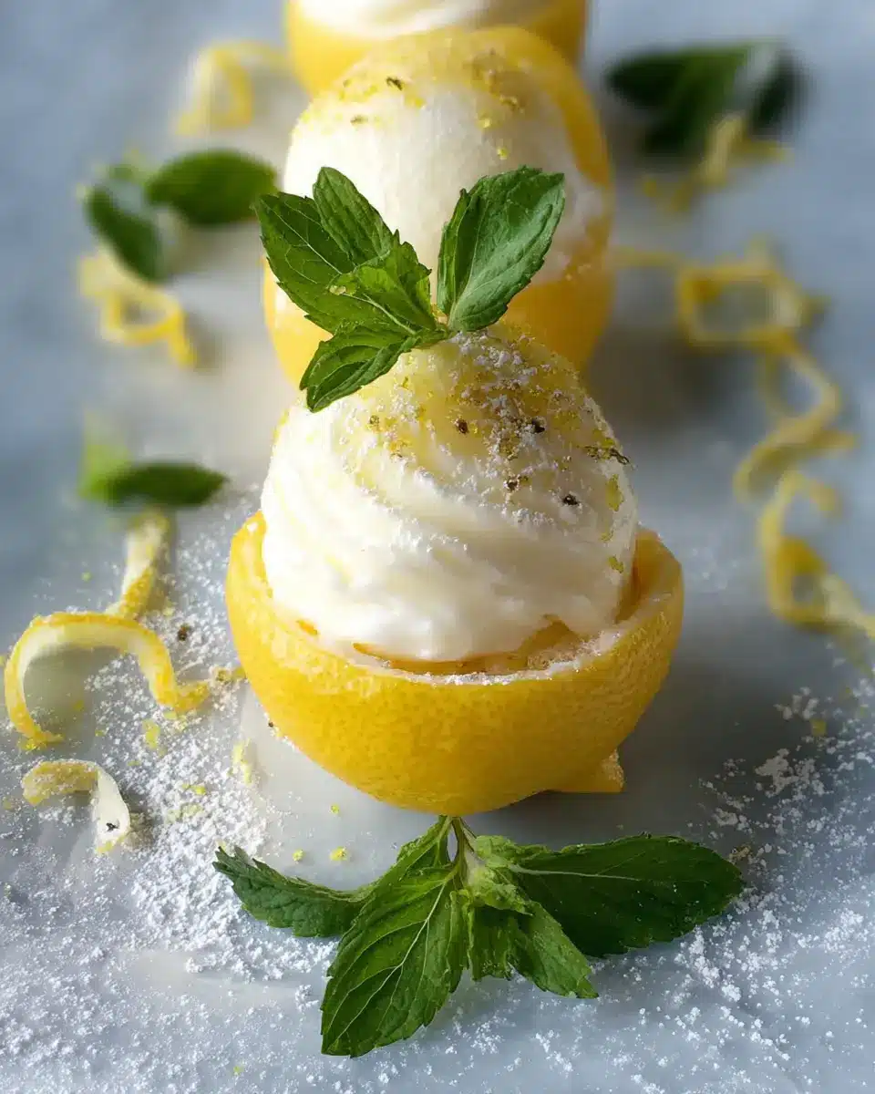 Transform your sorbetto di limone into a centerpiece! These stunning frozen lemon shells can be served on elegant plates or in chic martini glasses for a sophisticated touch. Consider adding a sprinkle of edible flowers or a drizzle of honey around the plate for a pop of color and sweetness. For an added flair, serve each lemon shell nestled on a bed of crushed ice, mimicking a seaside retreat.