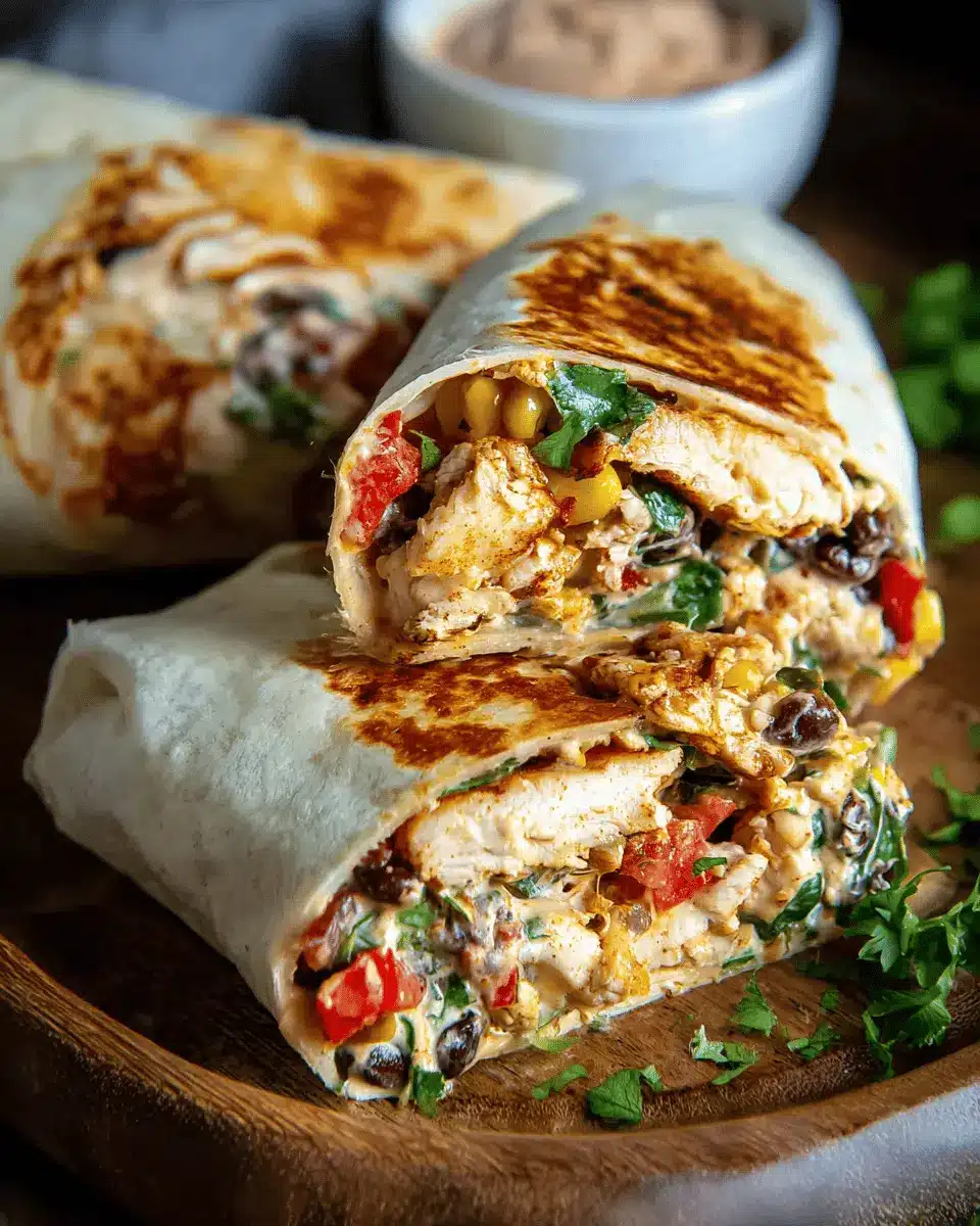 Now comes the fun part—assembly! Heat your tortillas just until pliable. Spread a layer of rice as a base, then add the chicken and sautéed veggies, alongside black beans, corn, and a sprinkle of cotija cheese. Drizzle with the Southwestern crema you prepared earlier, making sure it’s generous for that creamy depth. Wrap it up tightly, just like a burrito, to hold everything together.