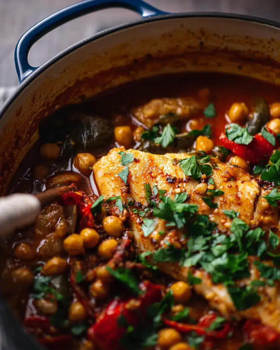 - Carefully lift the fillets from the pot and serve them on plates with a generous helping of the sauce and chickpeas. Garnish with additional fresh cilantro for brightness. Serve with bread or rice to soak up the flavorful sauce.
