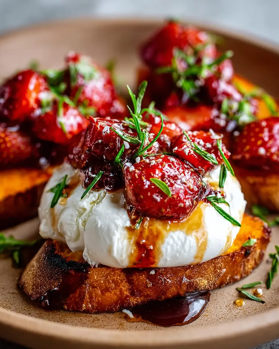 Once your strawberries are roasted and the sweet potato crostini are perfectly crisp, let’s bring it all together! On a serving plate, place the rich burrata cheese at the center. Gently layer the roasted strawberries over the burrata, allowing those vibrant juices to flow over and infuse every bite. Surround the burrata with your sweet potato rounds, creating an inviting presentation that will surely impress your guests.