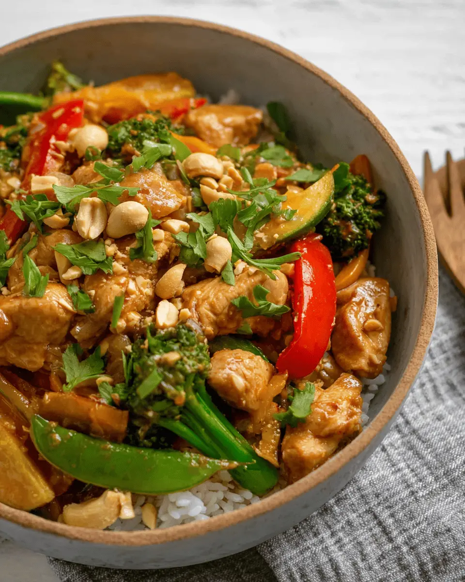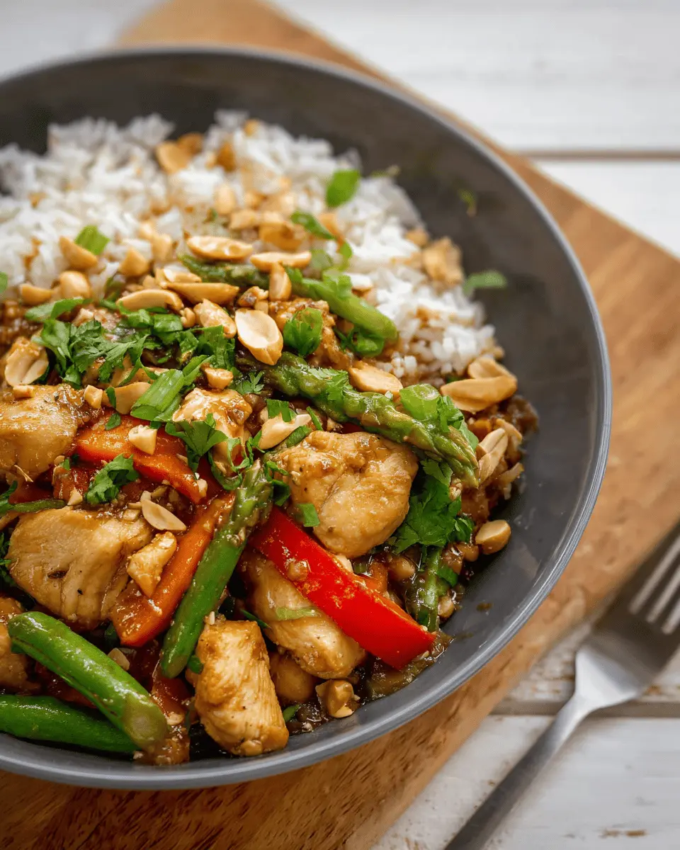 Packed with protein, this dish offers 28 grams per serving thanks to the tender chicken and nutrient-dense peanuts, making it a great choice for muscle repair and maintenance.