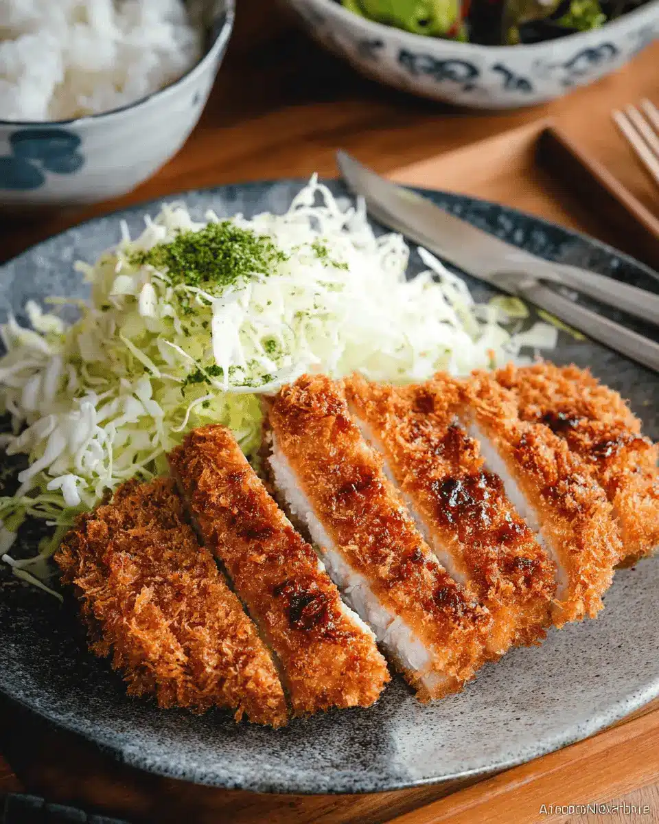 When serving your tonkatsu, accompany it with finely shredded cabbage, which adds a refreshing crunch. The cabbage is not just a garnish; it beautifully complements the rich flavor of the cutlet. For dipping, try a sesame tonkatsu sauce, mixing toasted sesame seeds with traditional tonkatsu sauce. This combination enhances the overall dining experience, offering a delightful contrast between the crispy meat and the fresh veggies.