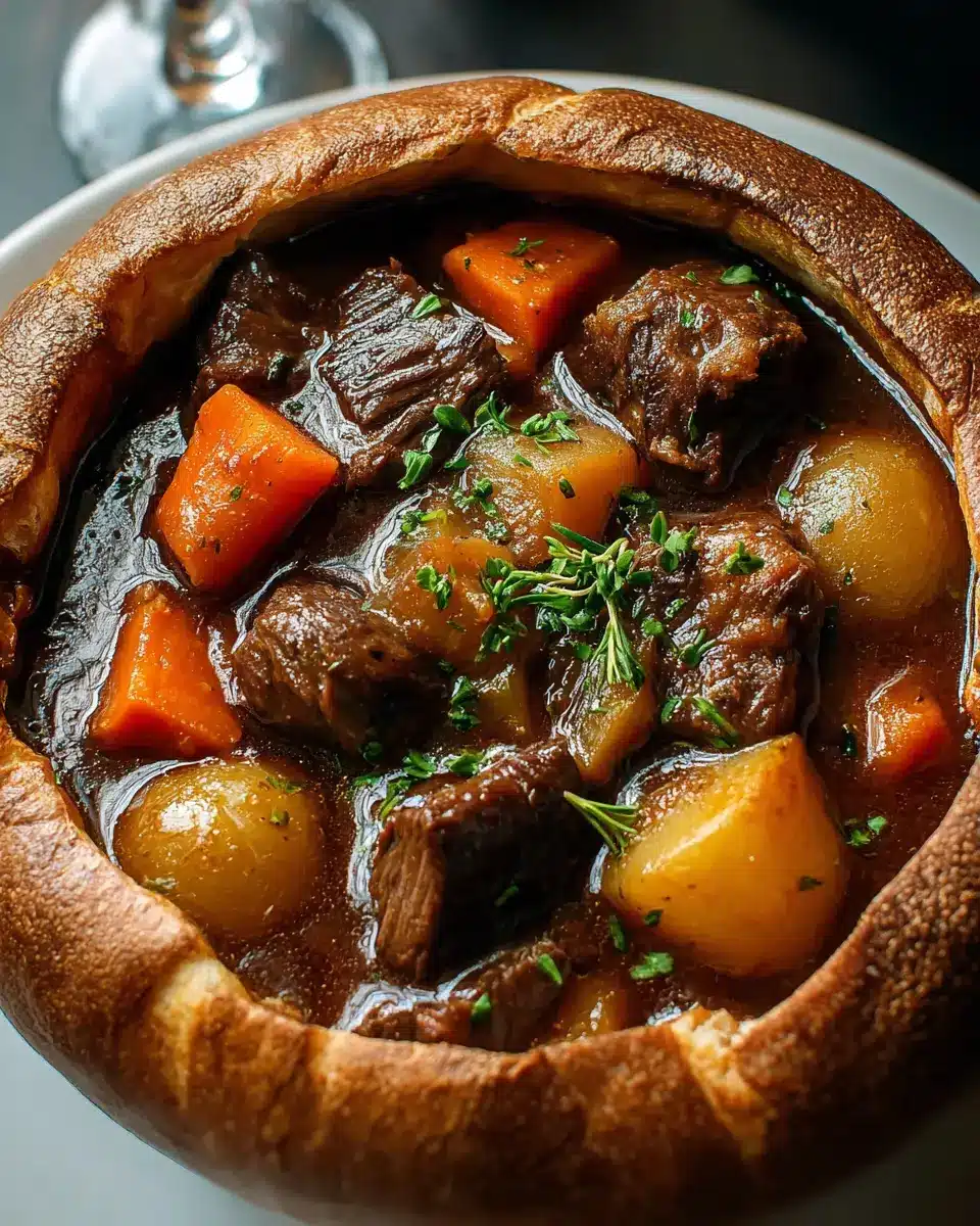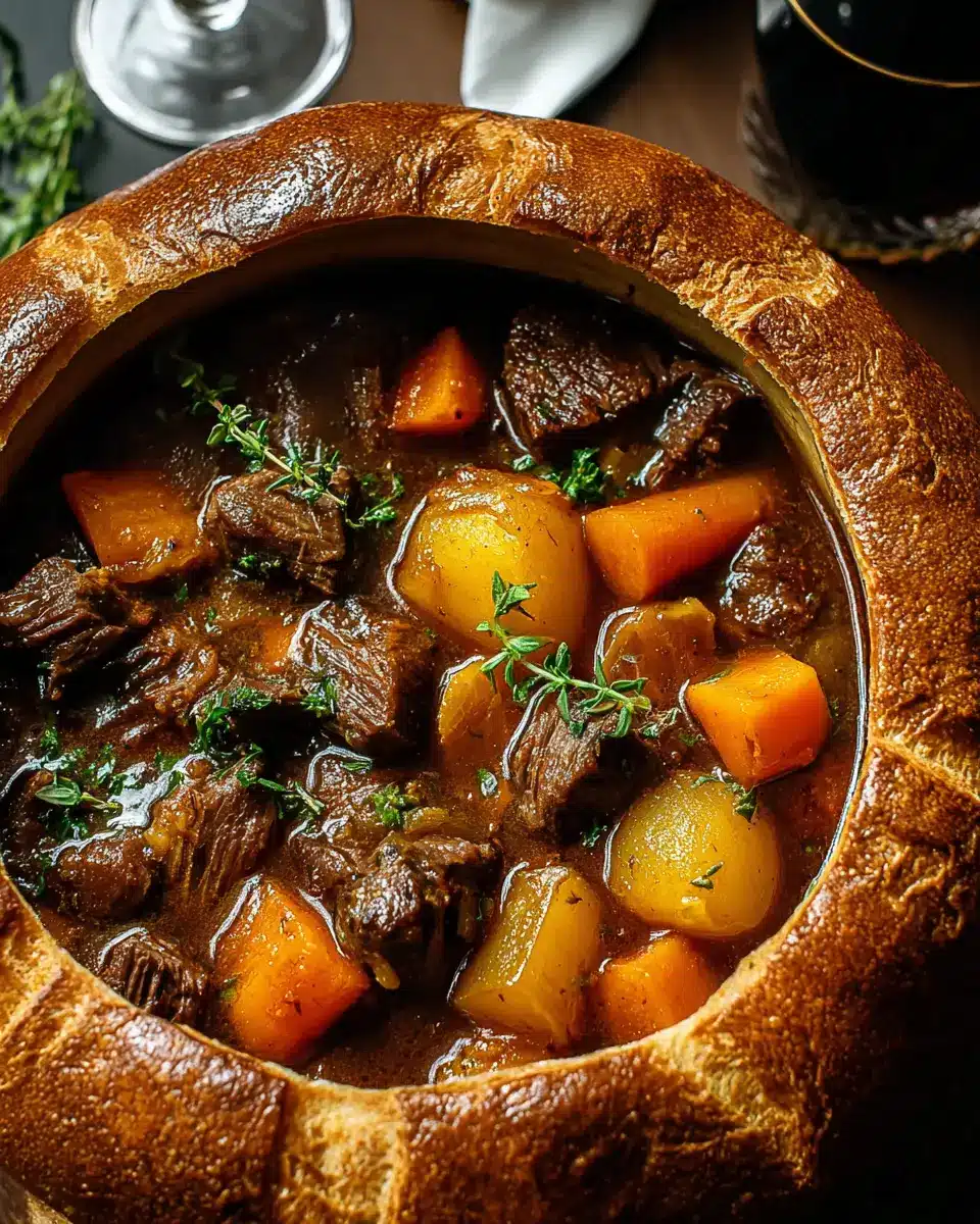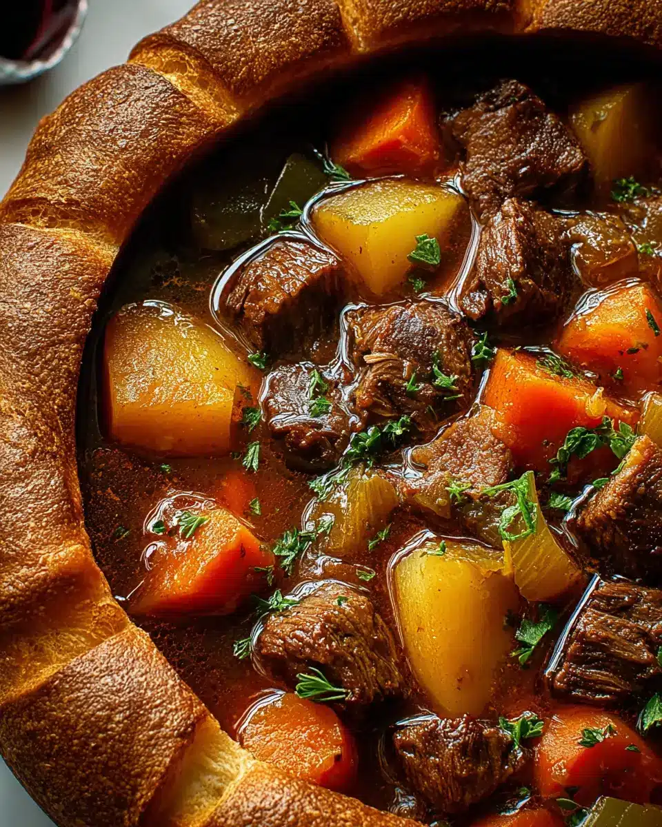 Picture this: tender beef simmering alongside vibrant root vegetables, all brought together with rich flavors. The addition of hearty ingredients, like carrots and potatoes, ensures every bite satisfies your hunger and warms your soul. The unique presentation in hollowed-out bread bowls not only elevates the dish but also makes it a conversation starter at any meal.